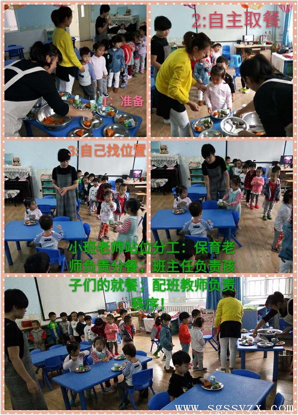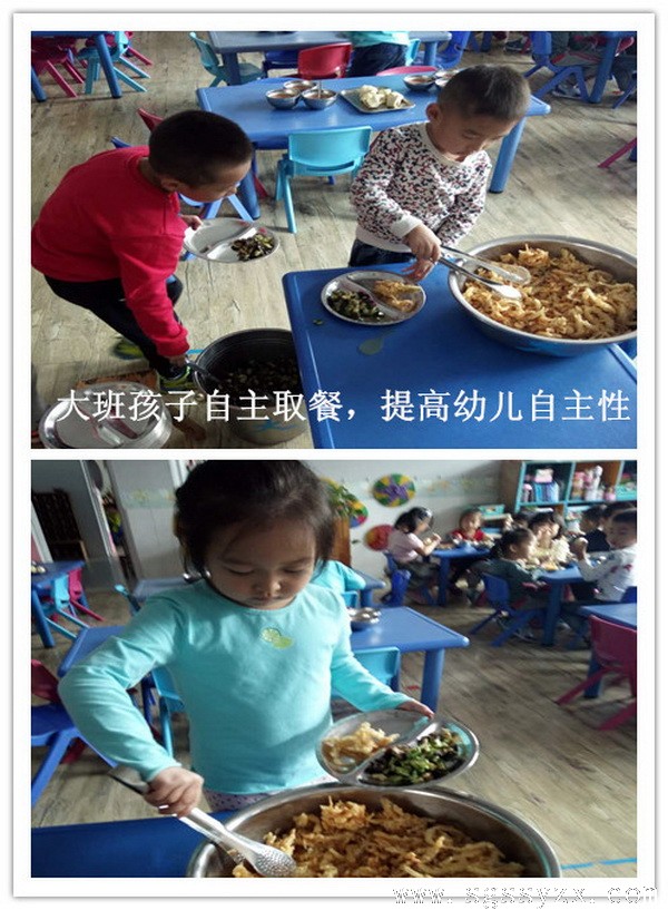 大班尝试让幼儿自己动手拿餐具、盛饭菜、端碗盘,进行自我服务,自主决定饭菜数量,吃多少取多少,杜绝了浪费,同时锻炼了幼儿的手部动作能力;中班尝试让幼儿自主取餐具、排队由老师分餐、按需按量取水果;小班则是由老师分好,孩子自己取餐。在活动过程中,孩子们本着按需取餐的原则,自主有序的进餐,老师负责维持秩序及安全,真正实现了幼儿在生活上的独立自主。