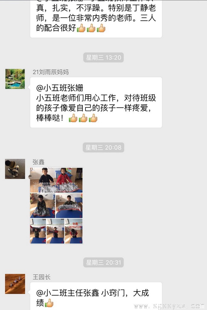 该群由园长、副园长、级部主任、保育主任及班主任组成。园长、级部主任、保育主任们把在一日活动中督查到的亮点和不足,以图文并茂的形式发到群里,使各班主任都能及时了解到自己班级的优势与存在的不足。另外各班主任也定期在督查群里分享自己在班级工作中的亮点及好的教育方法。各园长及级部主任对群里管理人员发送的每条短讯都及时的进行评价,并提出合理化的建议和意见。