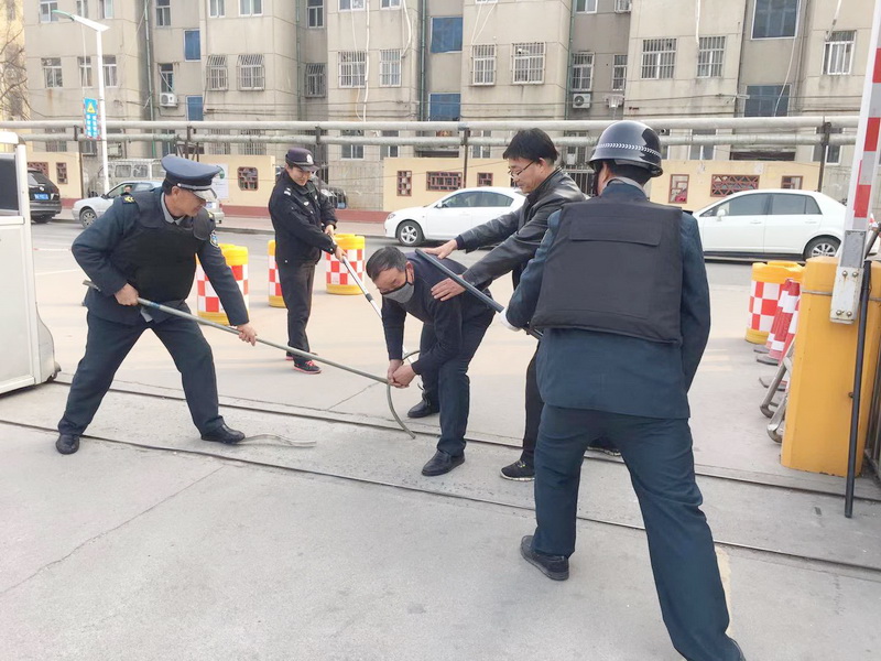 上午10点,防暴演练正式开始。学校一名保安假装“歹徒”强行进入校园,安保人员及应急小组成员立即拿起防护钢叉极力制止“歹徒”进入行凶,安保科第一时间拉起警报,班级老师听到警报后带领学生迅速躲避逃生,并锁好门窗,防止“歹徒”闯入班级伤害学生。