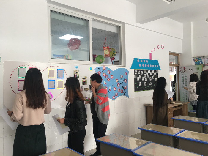 副校长方秀梅带领各班主任进行评选,并对各班黑板报、图书角、墙壁、走廊等环境布置进行点评,指出各班的优缺点,供大家互相学习,并提出精心设计打造个性化的班级的建议,真正做到“让环境说话”。