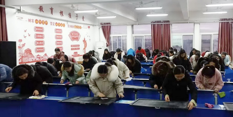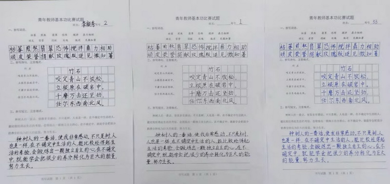 本次大赛采取现场书写的比赛形式,60名青年教师神情专注,精心书写。参赛作品或刚劲有力,或清秀柔美,充分展现了青年教师扎实的专业基本功。赛后,由专业评委对每一位教师的作品进行仔细地评比打分,最终评出一二三等奖若干名。