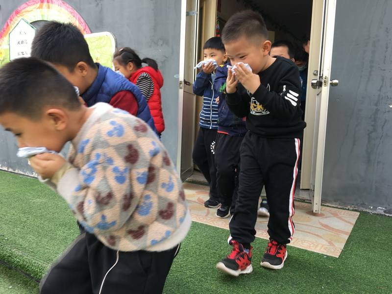 随着警报声响起,幼儿用湿毛巾捂住口鼻、弯下身体,在教师带领下沿预定路线快速有序撤离到安全地带。随后各班清点人数,确保幼儿无一人滞留。