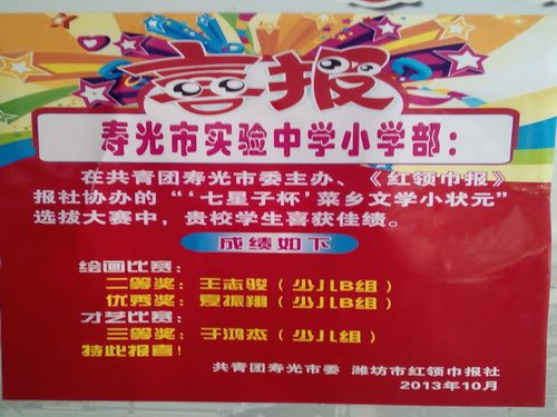 近日,在共青团寿光市委主办、《红领巾报》报社协办的首届“七星子杯”菜乡文学小状元选拔大赛中,实验中学小学部王志骏、夏振翔两位同学分别荣获少儿B组绘画类二等奖和优秀奖;于鸿杰同学荣获少儿组才艺比赛三等奖。