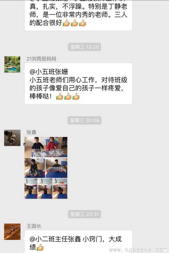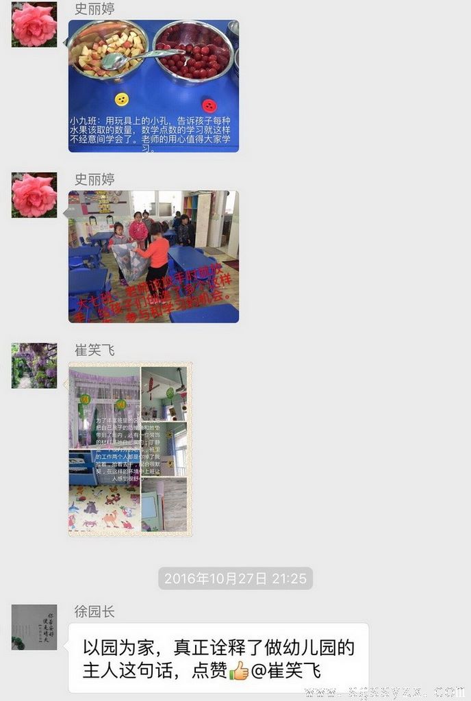 该群由园长、副园长、级部主任、保育主任及班主任组成。园长、级部主任、保育主任们把在一日活动中督查到的亮点和不足,以图文并茂的形式发到群里,使各班主任都能及时了解到自己班级的优势与存在的不足。另外各班主任也定期在督查群里分享自己在班级工作中的亮点及好的教育方法。各园长及级部主任对群里管理人员发送的每条短讯都及时的进行评价,并提出合理化的建议和意见。