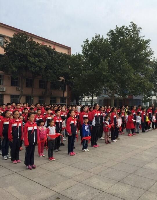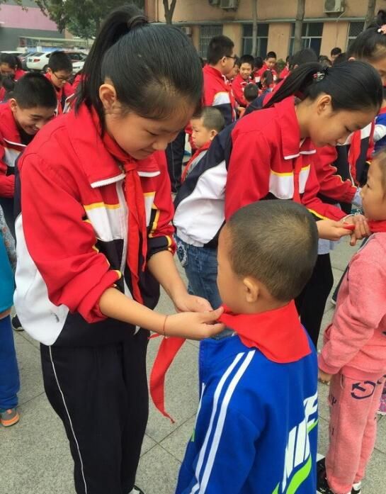 在少先队音乐声中, 五六年级老队员为205名一年级新队员佩戴了鲜艳的红领巾,欢迎他们加入中国少年先锋队。新队员代表发言,表示入队后严格要求自己,争当一名优秀的少先队员。全体新队员在少先队大队长的带领下,在庄严的队旗下,高高地举起右手大声宣誓,时刻准备着为共产主义事业而奋斗!