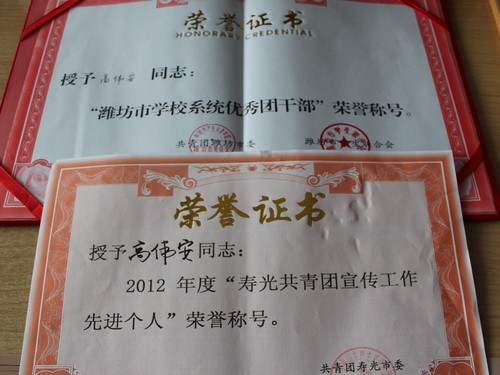 近日,在共青团潍坊市委、潍坊市学生联合会联合开展的潍坊市2012年度学校系统“优秀团干部”评选活动中,市实验中学团支部书记荣获“潍坊市学校系统优秀团干部”称号。