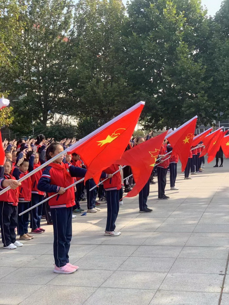 嘹亮的国歌声中,鲜艳的五星红旗迎着朝阳冉冉升起。副校长方秀梅宣读《习近平总书记致中国少年先锋队建队70周年的贺信》;少先队员代表在国旗下讲话;全体少先队员在大队辅导员带领下,重温入队呼号;四年级的孩子们将最美的歌声唱响了爱国的主旋律,表达出全体师生礼赞祖国、奋进新时代的浓浓深情。 (作者:魏静 审核:张启江)